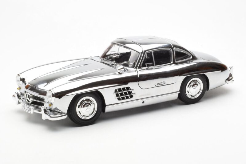 The Mercedes 300 SL W198 Χρώμιο Minichamps 1:18 is crafted from Μέταλλο. Die-cast zinc alloy body with detailed plastic parts, rubber tires, and high-quality paint finish. Die-cast models are known for their weight, durability, and realistic feel.