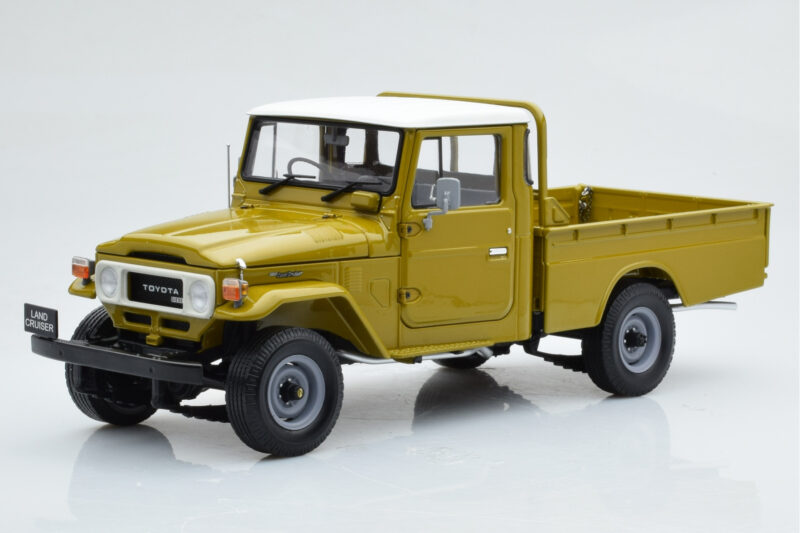 The Toyota Land Cruiser 40 4x4 Pickup Ελιά Kyosho 1:18 is crafted from Μέταλλο. Die-cast zinc alloy body with detailed plastic parts, rubber tires, and high-quality paint finish. Die-cast models are known for their weight, durability, and realistic feel.
